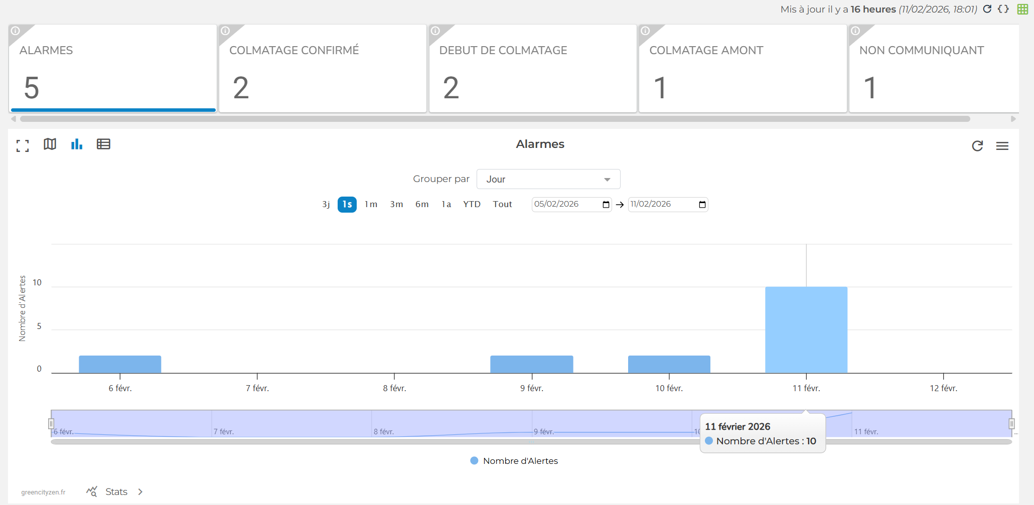 Le tableau de bord des alertes est un composant activable sur la plateforme. S'il n'est pas activé sur votre Cluster, contactez le support Greencityzen support@greencityzen.fr