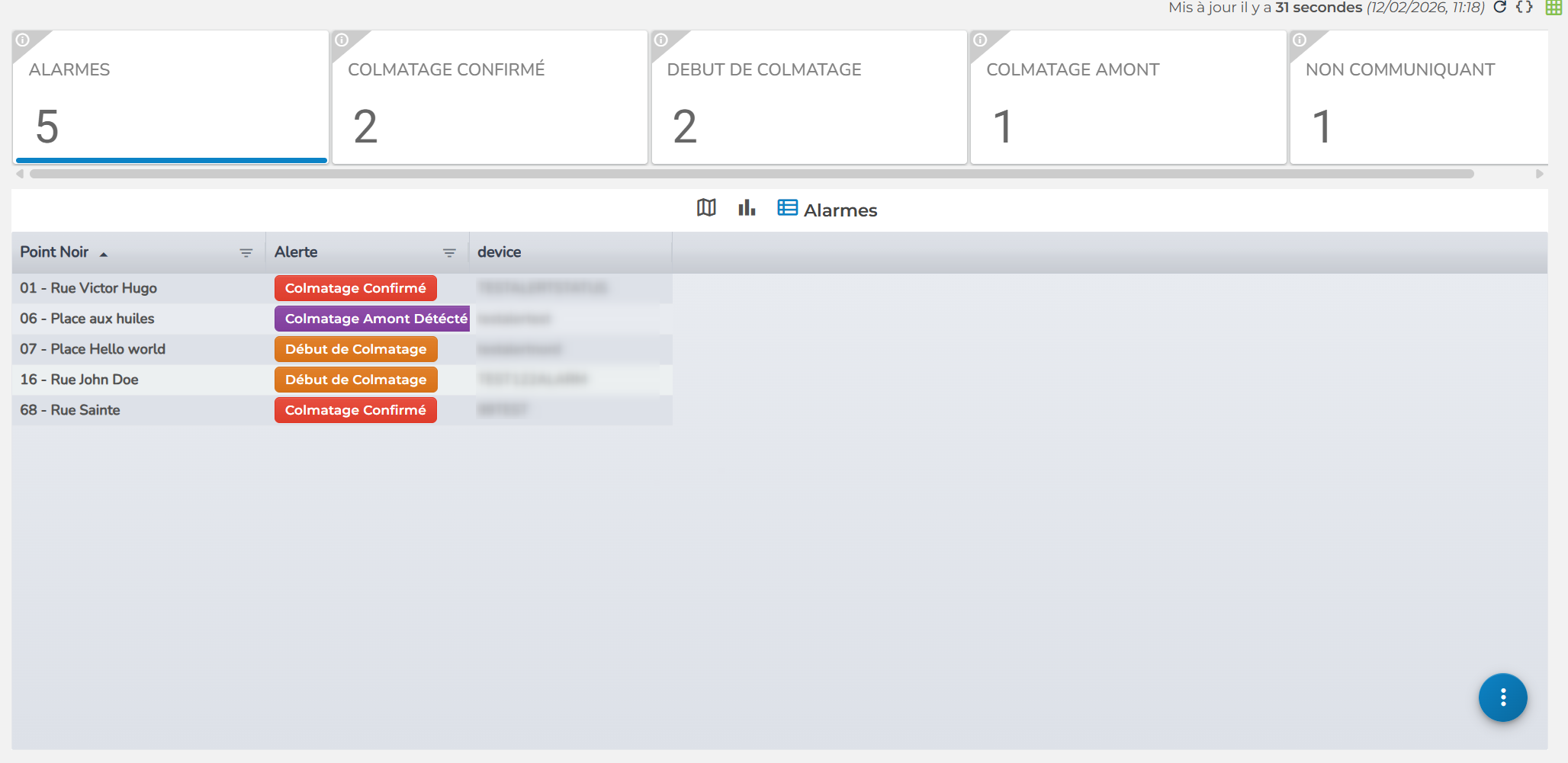 Tableau de bord des alertes Points Noirs